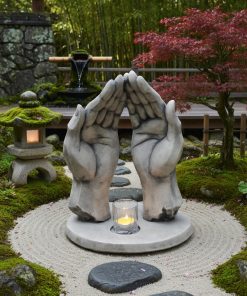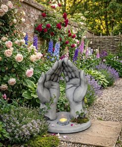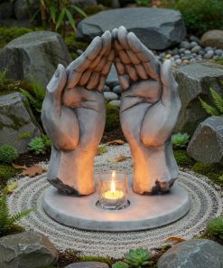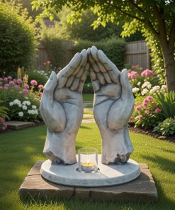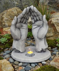 Figura wykonana z wysokiej jakości betonu przedstawiająca dłonie chroniące światło świecy. Dłonie ustawione na okrągłej platformie są skierowane do siebie. W środku jest miejsce na świecznik. Figura w sprzedaży bez pucharka i świeczki.