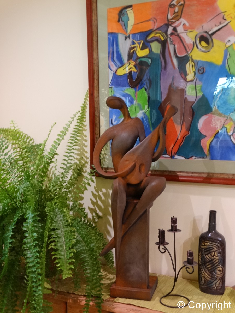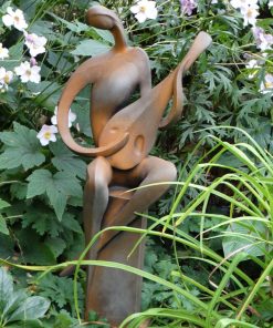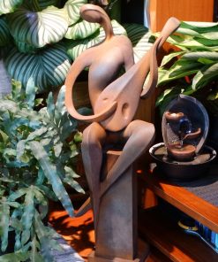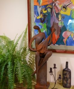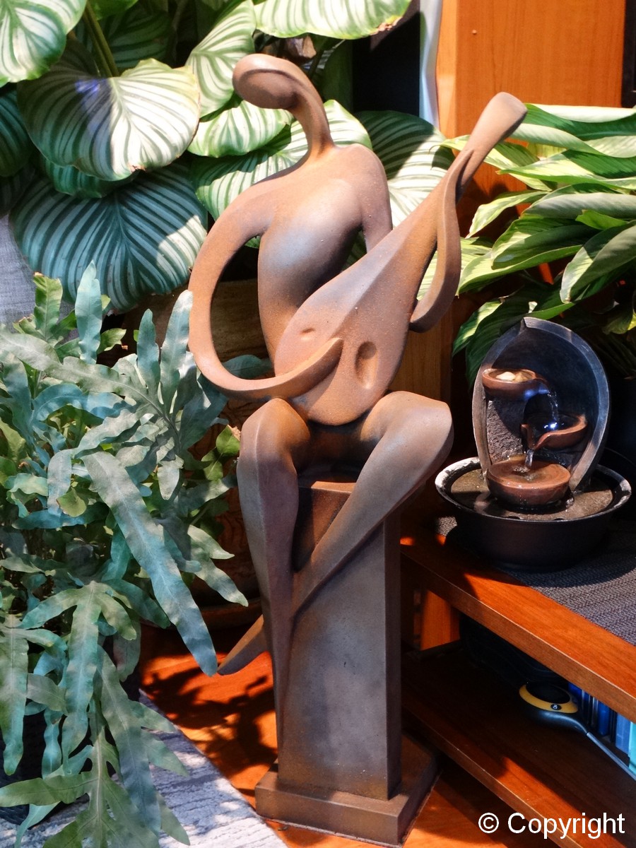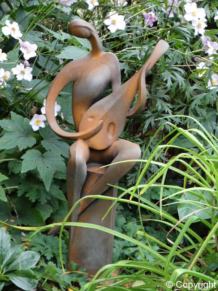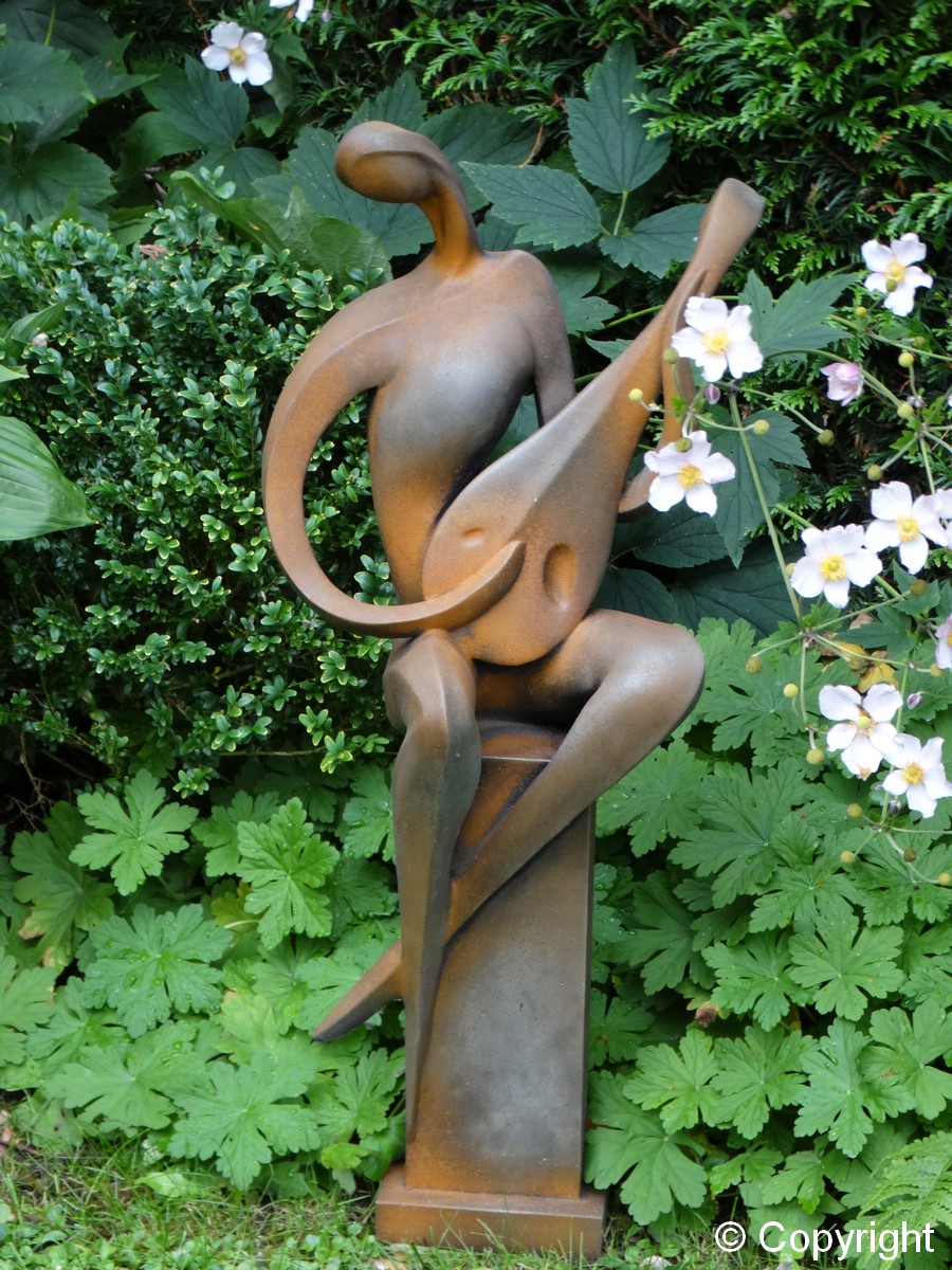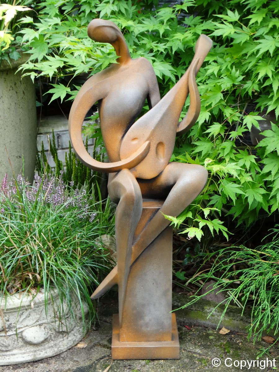 Betonowa ozdobna figura – grajek siedzący na kolumnie i grający na mandolinie. Piękna ozdoba ogrodów i wnętrz. Figura wykonana w specjalnym efekcie „przyprószenia rdzą”.