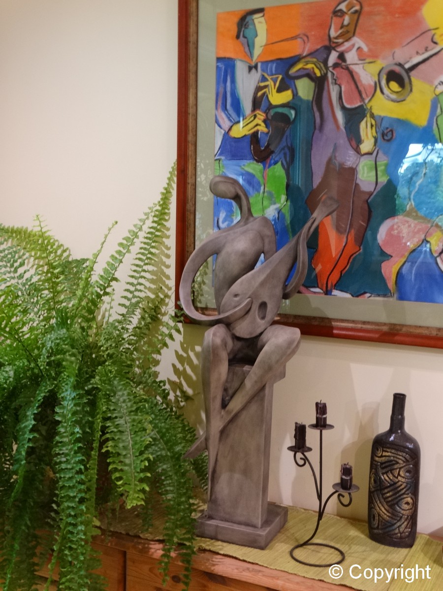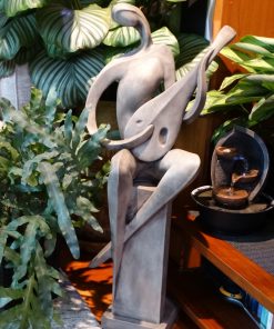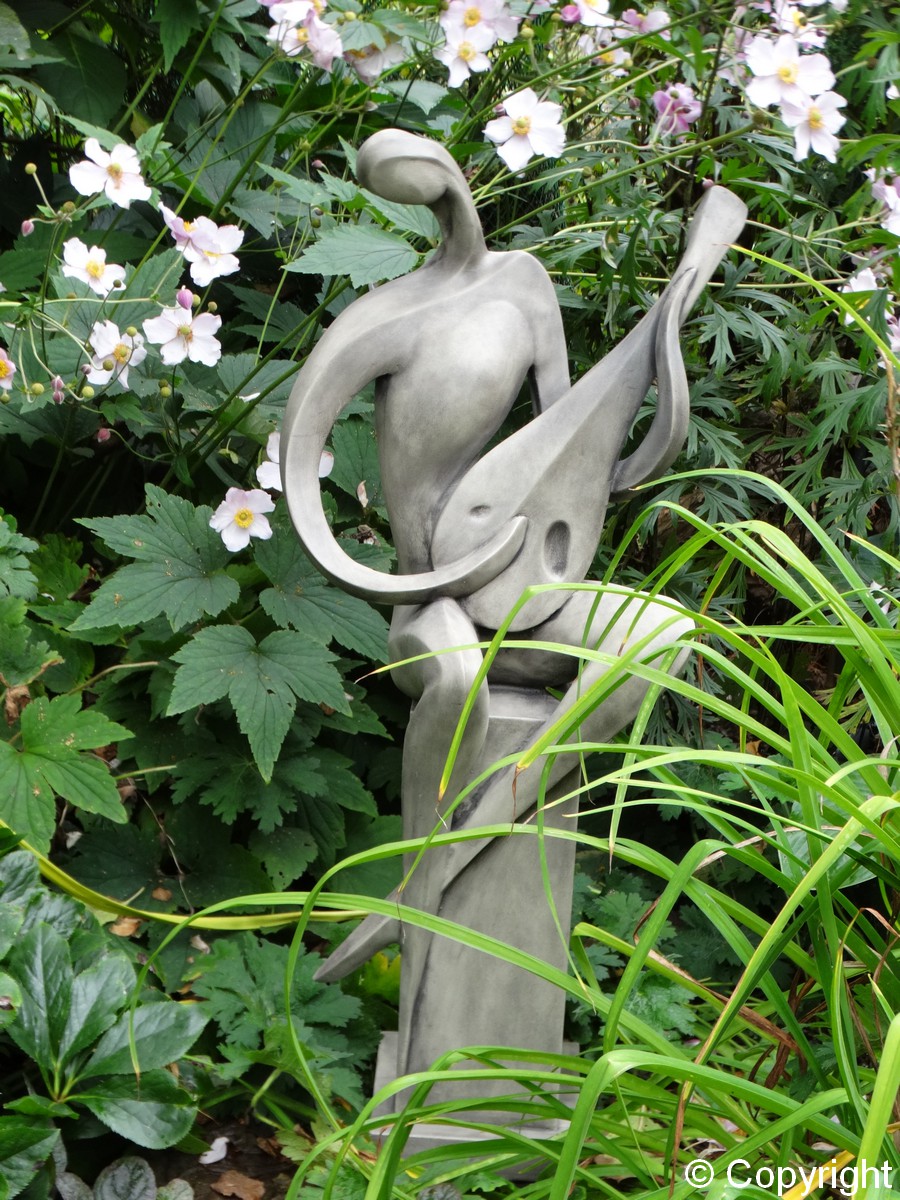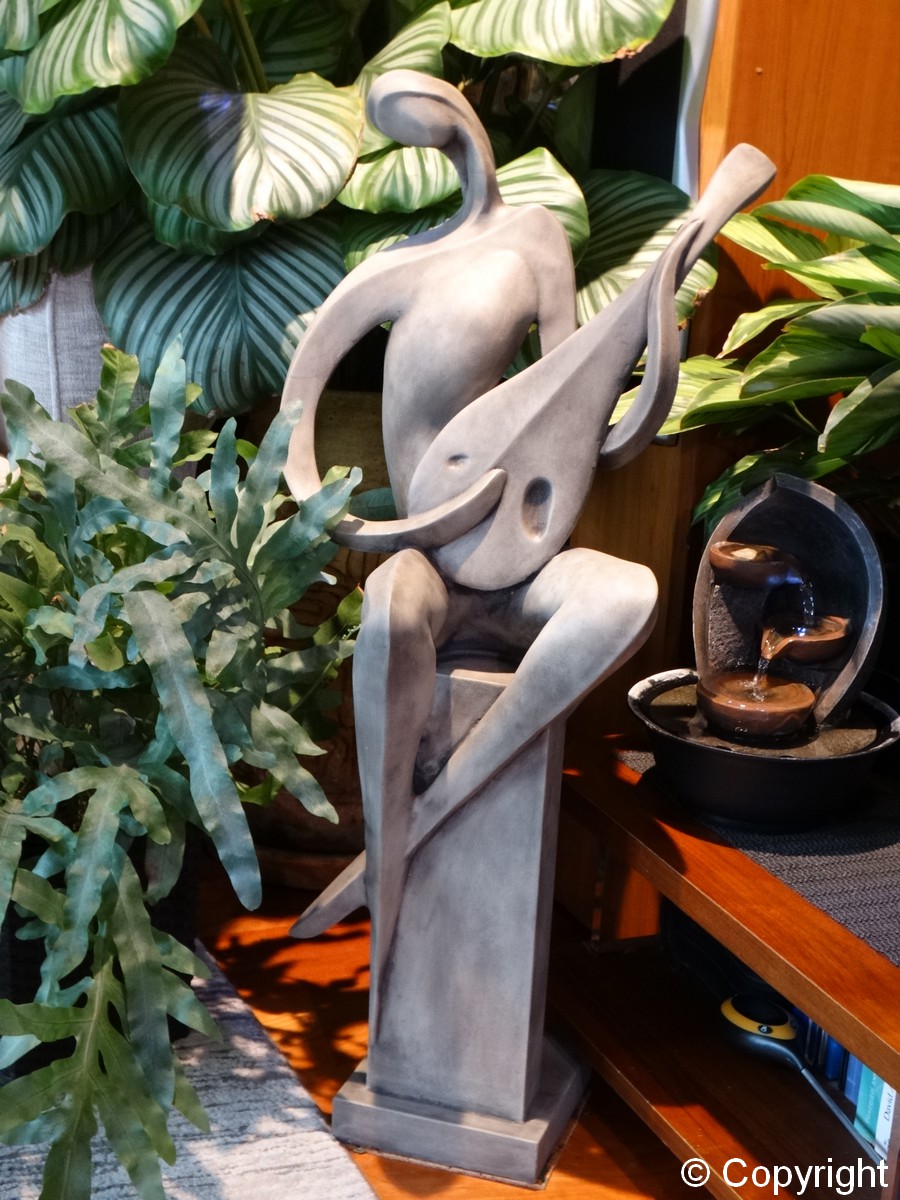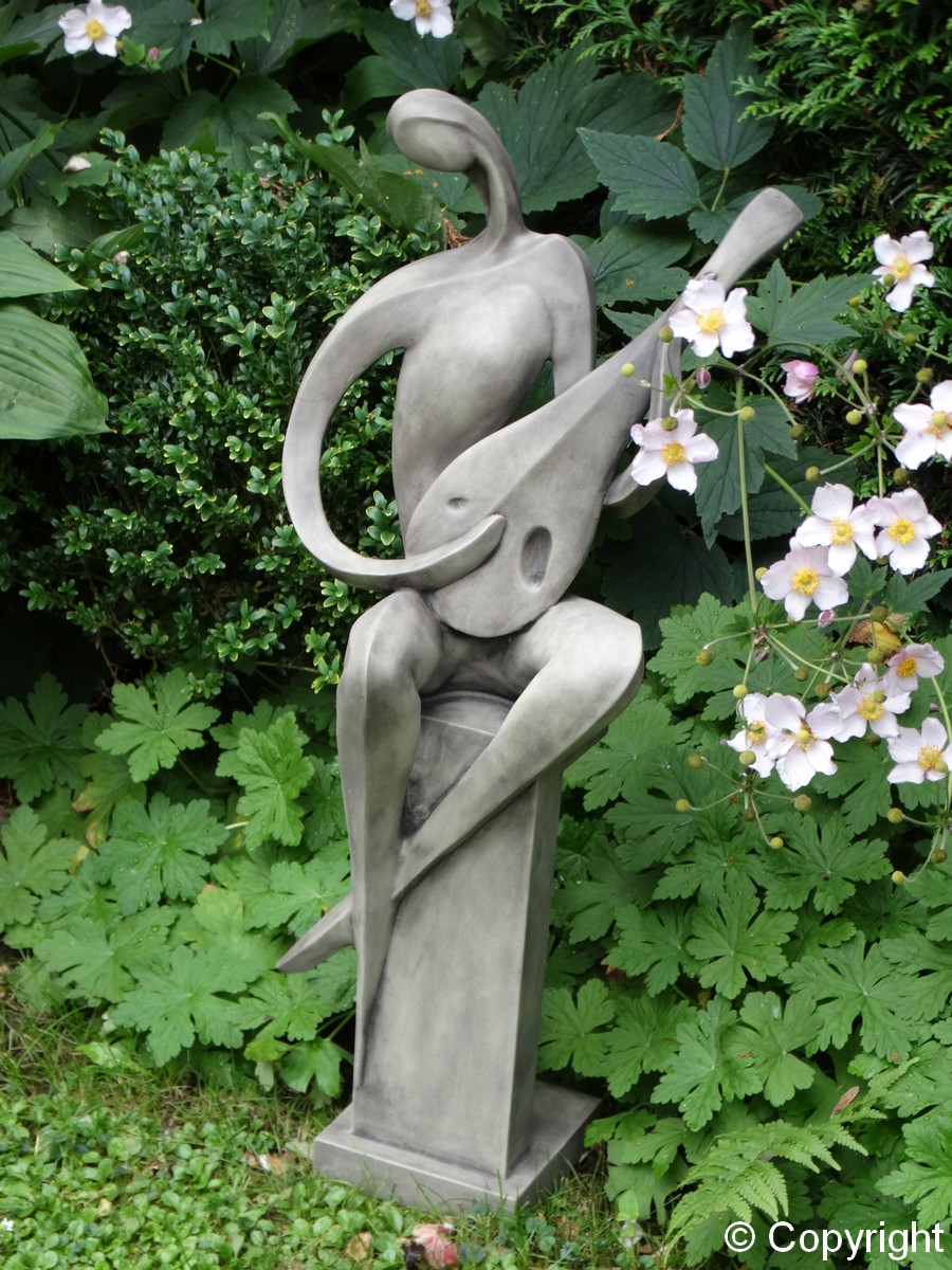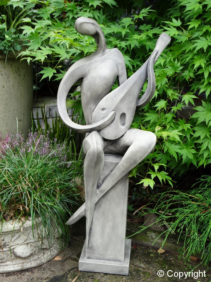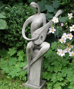 Nowoczesna figura przedstawiająca grajka siedzącego na kolumnie. Grajek gra na mandolinie. Nie za duża figura może zdobić ogrody i wnętrza.